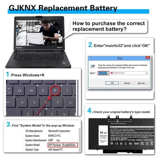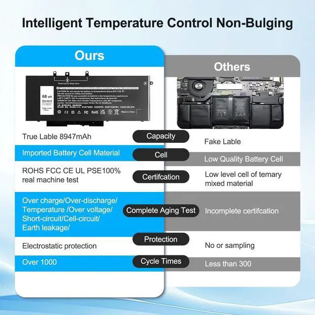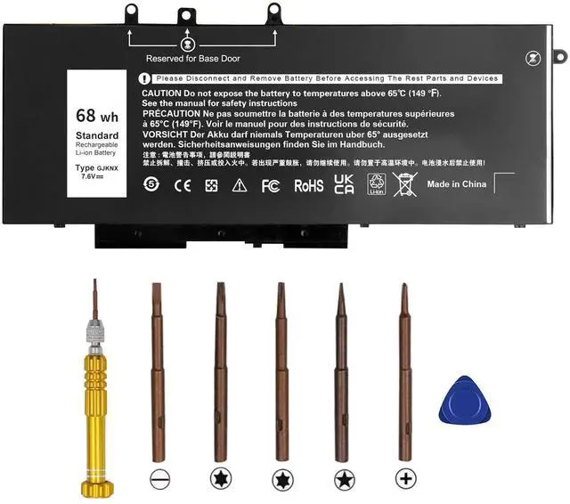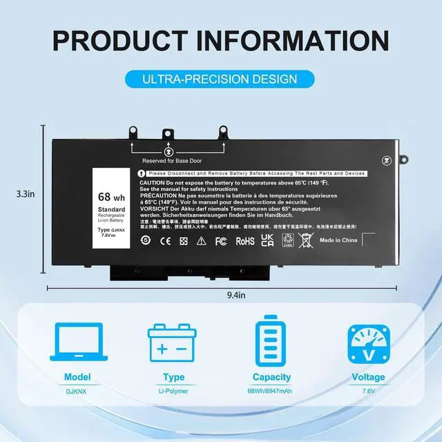 PRODUCT SPECIFICATIONS Li-ion rechargeable battery, Voltage 7.6V, Capacity 68Wh, 4-cell design, built with premium cells for stable performance and long-lasting power. Supports up to 1000 charge cycles and ensures efficient, reliable energy output. ^^ COMPATIBLE MODELS Compatible with Dell Latitude 5480 5488 5280 5288 5490 5590 5495 5491 5591, Dell Latitude 5580 (only M. 2 storage models), Dell Precision 3520 3530, and Dell Latitude E5280 E5288 E5480 E5580 E5490 E5590. Please confirm your original batterys model, voltage, and shape before purchase. ^^ REPLACEMENT PART NUMBERS Direct replacement for GJKNX GD1JP 0GD1JP DY9NT 0DY9NT 5YHR4 451-BBZG and other 68Wh 7.6V compatible Dell batteries ^^ SAFETY & CERTIFICATION Built with high-quality materials and protected by short-circuit, over-voltage, over-current, and over-discharge safeguards.