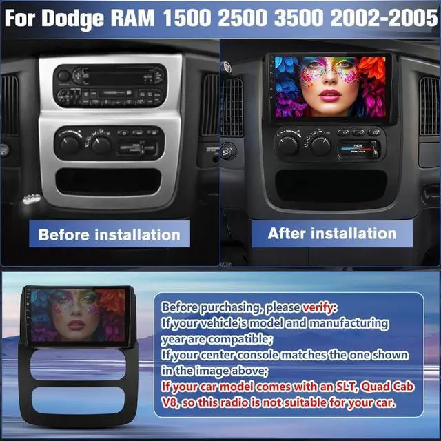 Android Head Unit for Dodge RAM This touch screen radio is specifically designed for Dodge RAM 1500/2500/3500 2002-2005. Ideal for Dodge RAM owners looking for a modern android car radio upgrade. Always confirm vehicle compatibility before purchasing. ^^ Wireless CarPlay & Android Auto This android head unit supports both wireless and wired Apple CarPlay and Android Auto, giving you full hands-free access to navigation, calls, messages, and music. Easily connect your phone via Bluetooth or USB and use voice control with Siri or Assistant of voice. It also supports screen mirroring to display your phones apps directly on the touch screen radio for car.