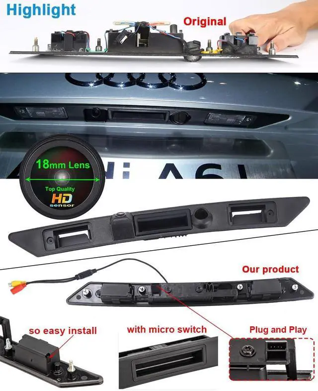 (OEM: 8E0827; 8E0827566; 8E08275763FZ) Replacement for Audi A4 S4 RS4 Quattro 8E2 B6 8EC B7 B8 8K2 1.6 1.8T 2.5TDI 2000/11-2004/12; Audi A124 Avant 8E 8E5 B6 1.6 1.8T 1.9TDI 2.5TDI 2.0FSI 3.0 quattro 2001/09-2004/12; Audi A4 Cabrio Cabriolet Convertible 8H 8H7 8HE 8ED B6 B7 1.8T 2.5TDI 2.5TDI 2. TDI 7TDI 7TDI 3. FSI quattro 2002/05-2006/12 ^^ Trunk lid grip. Trunk Tailgate Handle Switch. Handle strip with button boot tailgate handle opener micro switch. This is a vehicle-specific camera for replacing license plate lights / reserved holes / boot handles without adding additional holes to the car. Easy installation, after installation, it looks like it came with the factory. ^^ The wide viewing angle of 170 provides a full rear view area behind the vehicle and helps reliably identify people and objects in blind spots. ^^ As the navigator of some cars comes with the distance line, the camera is standard without distance guidelines to avoid overlapping redundant distance lines. If you need the distance guide lines, you can cut off the white line next to the camera and the guide distance line will be displayed (see picture).