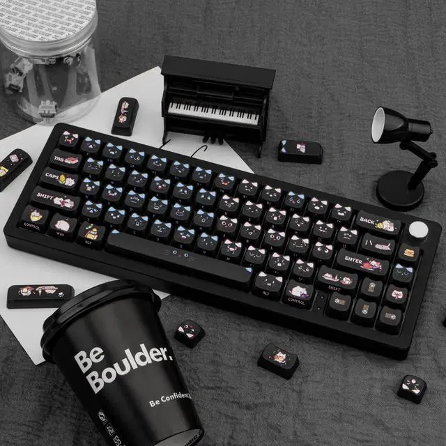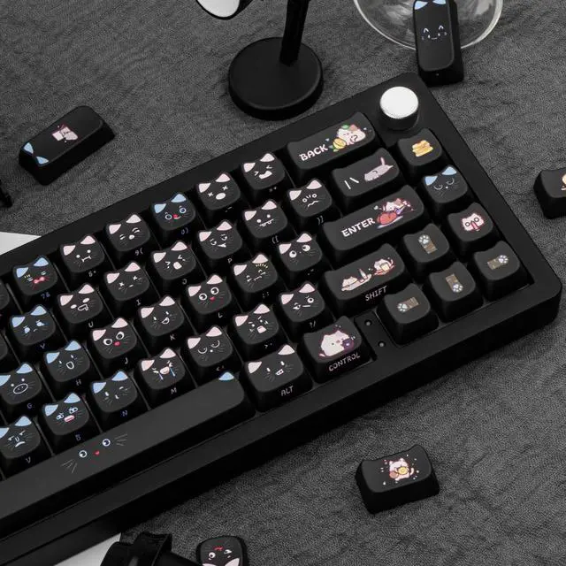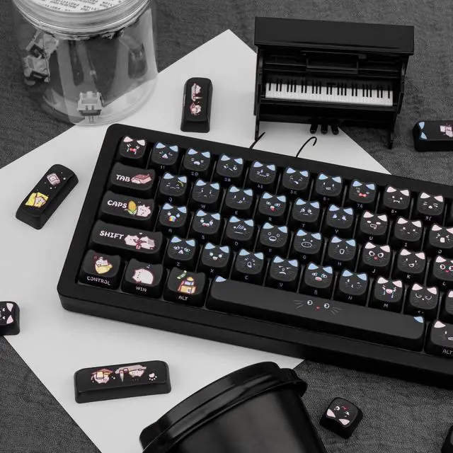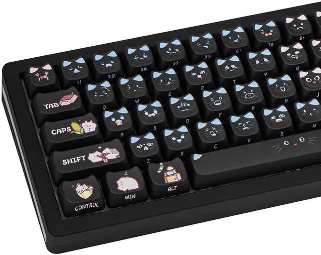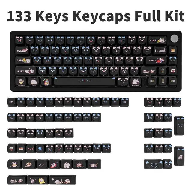 Thick PBT KeycapThese 133 keys cute black cat keycaps are made of PBT material, with a matte texture and anti-grease coating. These keycaps are resistant to wear and tear, thick and durable, fine workmanship, and not easy to get dirty. ^^ Cat Shaped KeycapsThe cute black cat keycaps designed with the MAO profile (cat face shaped), and increases the contact surface between the keycap and the fingers, you won't feel fatigued when using it for long time during work. ^^ Dye Sublimation TechniqueAdvanced dye-sublimation technology allows the color to penetrate into the keycaps, making the font and pattern on the cat keycaps very clear and beautiful, giving you a premium experience.