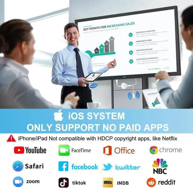 (Note: iOS devices require additional steps to connect to the adapters wireless signal) ^^ POPULAR APPS CASTING FROM ANDROID & WINDOWSSOCLLLife Wireless HDMI adapter allows you to cast your favorite apps (including Netfix, Prime Video, Hulu, YouTube, and TikTok, etc. ) from Android or Windows ( Win 10) device to your TV in seconds. Experience seamless HD casting with friends and family on a larger displaygreat for home theater, office presentation, or travel ^^ IOS MIRRORING WITH HDCP LIMITATIONSOur wireless HDMI adapter supports mirroring iOS devices such as i-Phone (including the newest model 17), i-Pad, and MacBook for movies, presentations, web browsing, and free apps like YouTube, Safari, WhatsApp, and Instagram.
