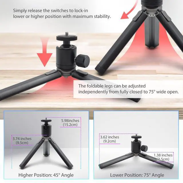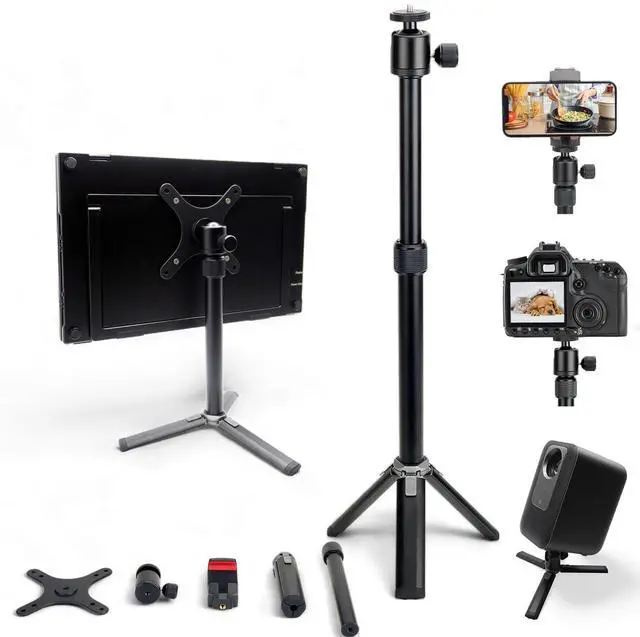 Compatibility for All - With the included 360 ball head, 1/4" screw hole to 100x100mm 75x75mm VESA bracket, as well as the tablet/phone clamp holder, this Kado Metal Tripod Stand Set serves as you all-in-one stand solution for portable monitor, phone, tablet, projector, camera, webcam, and more. ^^ 360 Premium Ball Head - Compact size, light weight and premium build quality, the 360 ball head ensures that you always have your best shooting or viewing angle possible. ^^ Full Clamping Range - The 2-in-1 tablet/phone clamp holder features a clamping range between 2.56 inches (65mm) and 8.86 inches (225mm), fully supporting all mobile phones, tablets/portable monitors up to 14.6", and most 15.6" portable monitors in the market with slim bezel less than 8.86 inches (225mm) in height top to bottom.