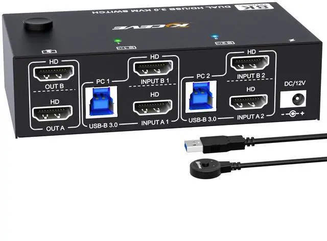 USB devices.: Need to connect the USB cable included in the package to the USB port of PC1/PC2 and the computer, otherwise the USB device will not be recognized. ^^ Compatibility & 2 Switching MethdosAOOCOO dual monitors KVM switch driver-free and plug and play. you can press the button on the panel or use the wired remote controllerincluded in the package to switch the computers. Two color lights indicate the active computer. ^^ Package List1*Dual Monitor 8K USB 3.0 KVM Switch+2*USB Cables( 1.5 m/ 4.9 ft)+ 1*Wired Remote Controller(( 1.5 m/ 4.9 ft))+1*User Manual.