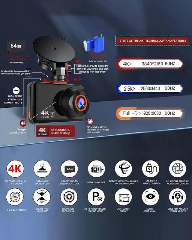 (Hardwire kit not included) ^^ Type-C Fast Charging & Stable Performance Built with reversible Type-C charging that charges 3X faster than traditional mini-USB, with high heat resistance and over 10, 000 plug cycles for durable, long-lasting use. ^^ Complete Kit & Smart WiFi App Control Comes with a 64GB SD card for instant use. Supports seamless loop recording and the Viidure App for real-time viewing, downloading, and sharing videos. Backed by an 18-month warranty for worry-free use.