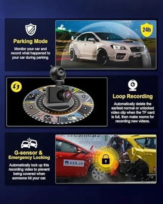 4K Front & 2.5K Rear Dual Cameras & 170 Ultra-Wide Angle Our dash cam features 4K (3840x2160) front camera and 2.5K rear camera to capture sharp license plates and road details. The 170 wide-angle lens greatly reduces blind spots, providing full road coverage for safer daily driving. ^^ Smart Resolution & Superior Night Vision The car camera uses 4K front recording for clear daytime footage and 2.5K rear recording optimized for low-light conditions. Advanced WDR & HDR technology ensures clear recording at night, in tunnels, or under strong light. ^^ 24H Parking Monitor & Intelligent G-Sensor With time-lapse recording and sensitive G-sensor, this dash cam automatically locks collision footage and provides 24/7 all-round protection for your parked vehicle.