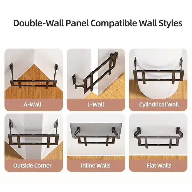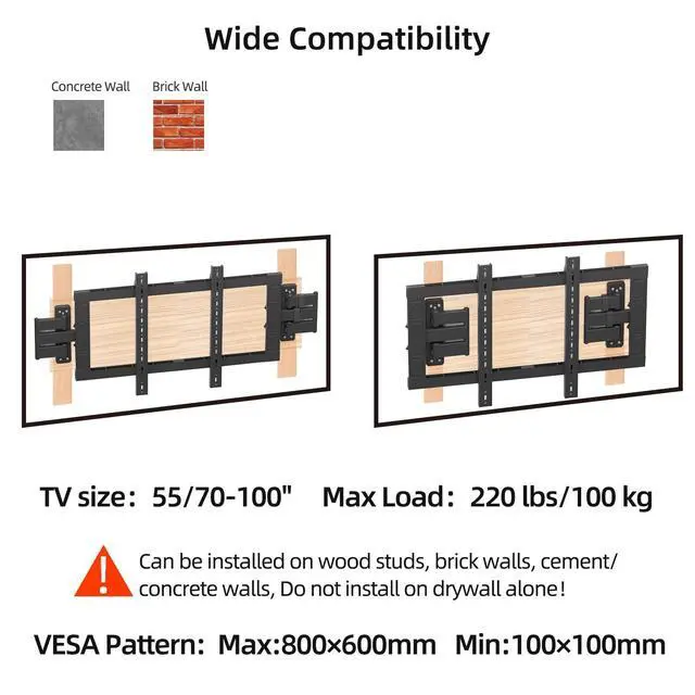 Heavy Duty Corner TV Wall MountDesigned for 70-100 inch TVs with exceptional 220 lbs load capacity. This corner wall mount tv bracketis designed specifically for corner installation. The separating wall panel of this corner TV bracket is compatible with irregular walls such as A-Walls, L-Walls, Cylindrical Wall, but also compatible with Flat Walls and Inline Walls just like any other articulating TV wall mount. ^^ Wide CompatibleThe Universal Heavy Duty Corner TV Bracket is specially designed to fit most flat and curved 70-100" screen LED, LCD, OLED and 4K TVs, hold up to 220 lbs, with VESA patterns 100x100 to 800x600mm.