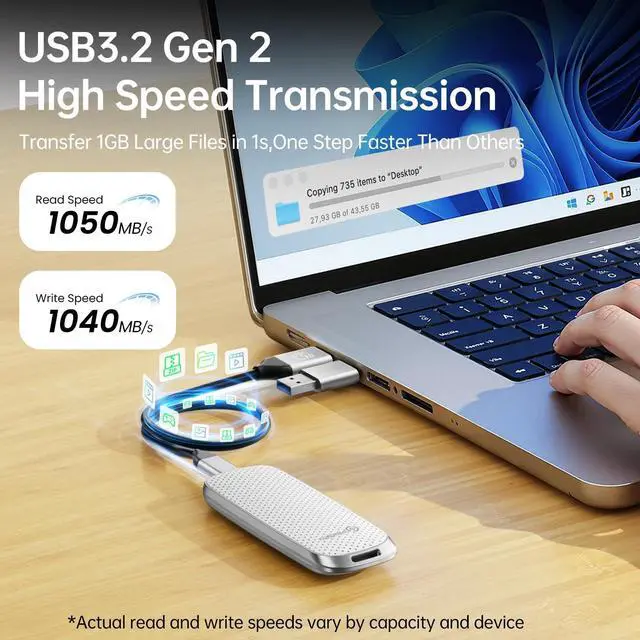 TRANSFERS: Equipped with USB 3.2 Gen2 interface, this P10PRO External NVMe SSD 1TB supports up to 10Gbps high speed data transmission, achieving real world read speeds up to 1050MB/s and write speeds up to 1040MB/s. Transfer 1GB of data in just one second, ideal for 4K video editing, game libraries and large business files, dramatically improving work efficiency. ^^ BUILT TO LAST, LIGHTWEIGHT: Designed with durable Zinc alloy & plastic shell, the external hard drive 1TB is shock resistant, drop resistant and dustproof, providing superior protection for your critical data. Whether you're commuting, on a business trip, traveling or shooting outdoors, this External Solid State Drive safeguards your files in any scenario, operating silently and reliably. ^^ PORTABLE DESIGN THAT TRAVELS WITH YOU: Measuring just 4.26 x 1.59 x 0.47 inches, it's made for life on the move. The integrated lanyard hole adds style and security, easily attach it to your business backpack, bag, keychain or belt loop. Compact enough to slide into your pocket, yet powerful enough to handle demanding workflows. ^^ UNIVERSAL COMPATIBILITY, ZERO