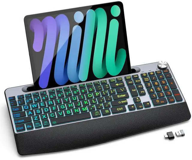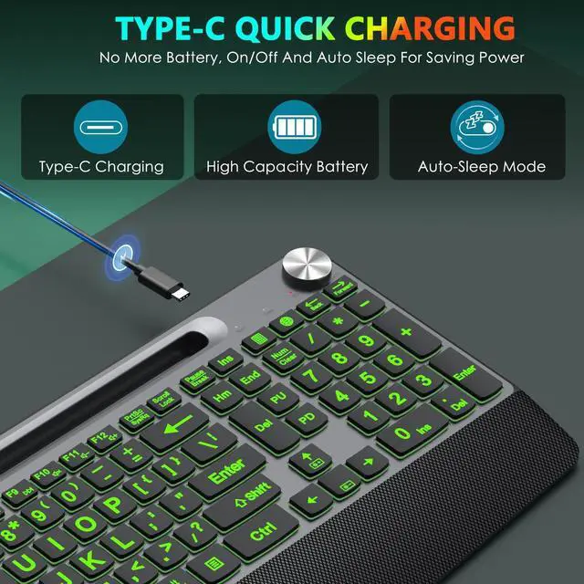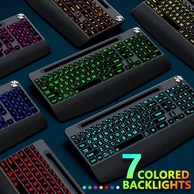 JOYACCESS Large Print Backlit Wireless Keyboard,2.4G Full Size Ergonomic Keyboard with Wrist Rest, 7-Color Light up and Oversiez Letter for Computer Laptop Windows-Black