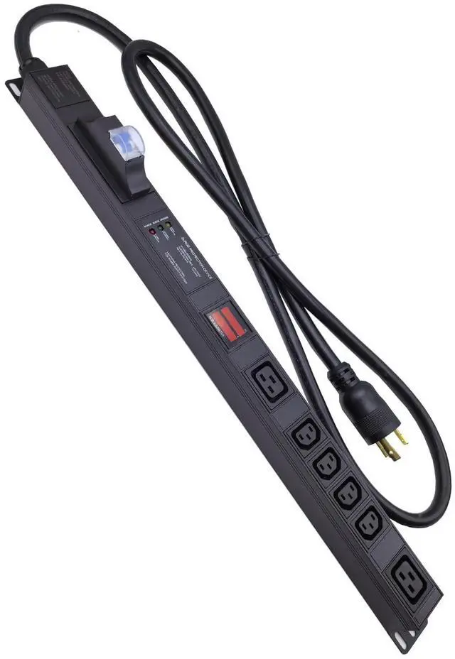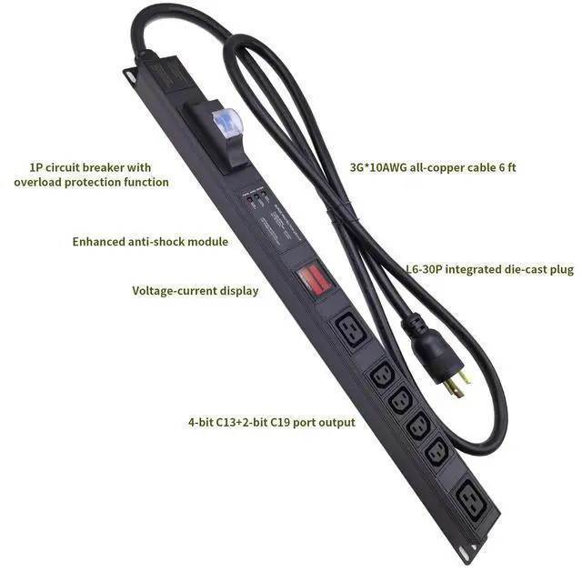 30 amp load. Use L6-30P 10wag power cord 6 ft, equipped with a voltage ammeter, three lights lightning protection module ^^ 1) with L6-30P Input, distributed up to 10A per outlet. 2) 6 of the C13 10Amp rated connectors for powering servers Rack Mount 1U Design, circuit breaker with cover to turn on PDU. 3) Designed and Built by a factory with CE and ISO certification and High Quality design. 4) 6 Foot/2 meters power input cable. 5) 125V, 208V, 220V, 230v, 240v, 250V 50/60Hz usage.