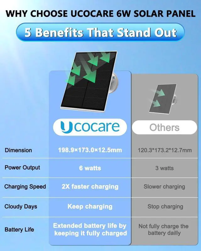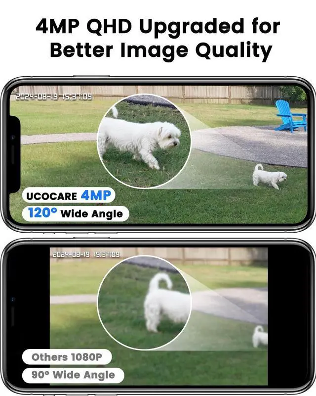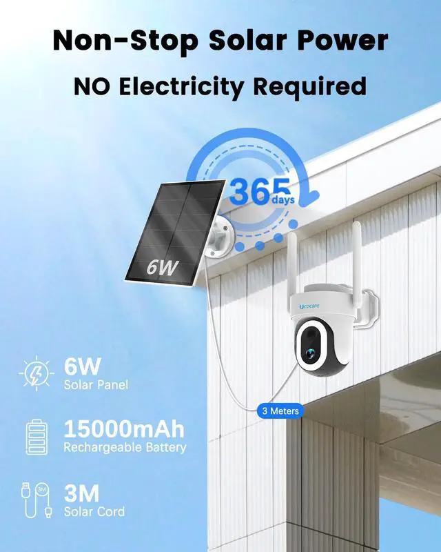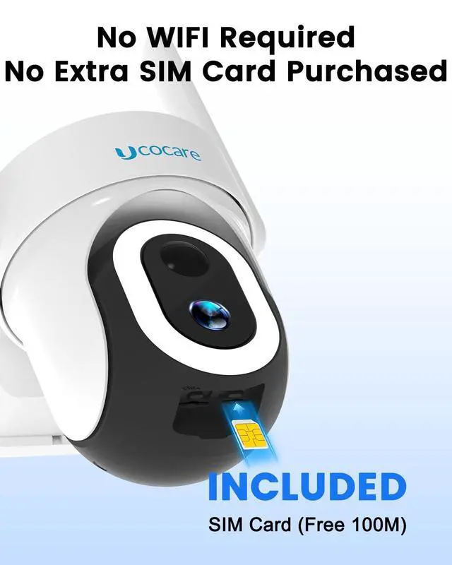 Note: the camera only works with the included SIM card and not with other carriers' SIM cards. ^^ Ideal for Areas without ElectricityEquipped with a 6W high-efficiency solar panel and a large 15, 000mAh rechargeable battery, the 4G LTE cellular security camera offers long-term operation day and night, unlike ordinary surveillance devices. Even in cloudy weather or low sunlight conditions, you don't need to worry about frequent recharging. The solar security camera ensures uninterrupted, around-the-clock monitoring, providing reliable security coverage for remote or hard-to-maintain areas. ^^ 4MP QHD Clear Vision & 360 Pan and Tilt ControlThe UCOCARE no wifi security camera outdoor solar delivers sharp, vibrant 4MP QHD images with a wide 120 field of view, allowing you to see every detail clearly and cover large areas with fewer blind spots. With easy remote control via the Cloudedge app, you can adjust the 4g lte cellular security cameras 355 pan, 120 tilt, and 5x digital zoom to monitor your property effectively and ensure you never miss a moment. ^^ Vivid Color/Super IR Night VisionThe 4G LTE cellular security cameras powerful 500-lumen floodlight provides bright, clear color views up to 65 feet, ensuring you can see details in low-light conditions like your driveway or backyard.