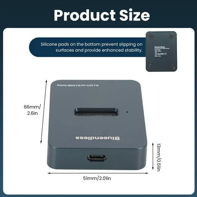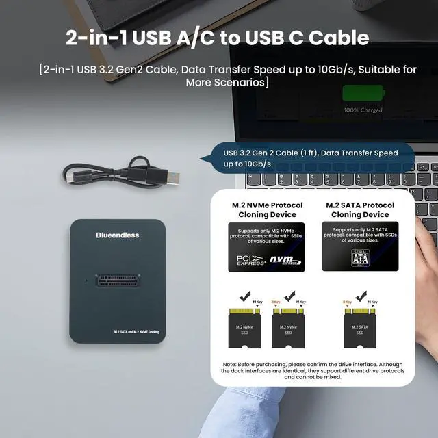 Transfer Speeds Up to 10Gbps: Equipped with an advanced chipset, this M.2 NVMe SATA to USB-C dock delivers exceptional transfer speeds. Via the USB 3.2 Gen 2 interface, M.2 NVMe drives achieve 10Gbps transfer rates, while M.2 SATA/NGFF drives reach 6Gbps. Effortlessly handle terabytes of data for smoother workflows