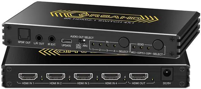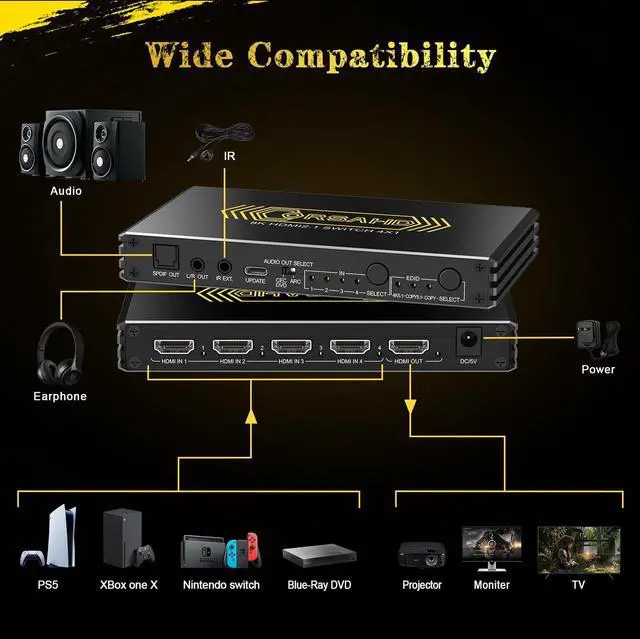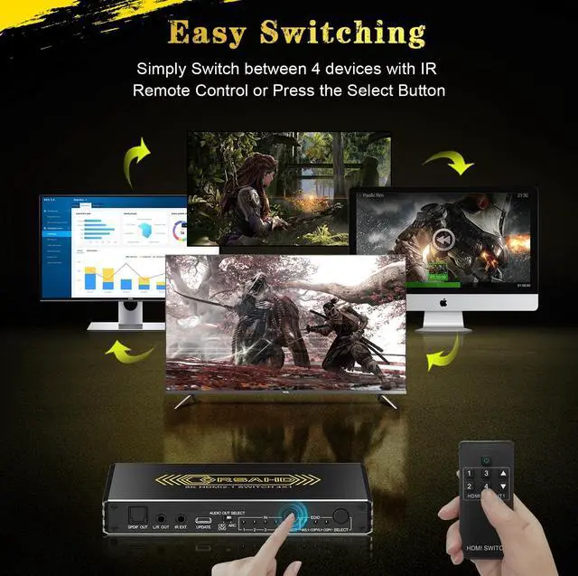 4K@120Hz HDMI 2.1 Switch 4x1 with Audio Extractor -- The 4 ports HDMI 2.1 Switch 4 in 1 out easily shares video and audio from 4 different HDMI sources with 1 HDMI display and 1 Optical Toslink SPDIF 5.1C h audio device or 1 AUX L/R 2.1C h audio device. Supports IR Remote control switch and CEC. NO lag, NO flash or drop in resolution. Easily switching between seamless transitions. No frequently plugging and unplugging needed. ^^ Video & Audio Format -- Video Format - HDMI 2.1 Switch 4 in 1 out supports multiple resolution up to 8K@60Hz 4K@120Hz 5120x1440@120Hz 1080P@240Hz 4:4: 4 8bit. Also supports VRR, ALLM, HDR 10, Dolby vision, 3D effect. Audio Format - Supports Optical Toslink SPDIF 5.1C h, AUX L/R 3.5 mm 2.1C h, ARC, Dolby Atmos, Dolby True HD, DTS-HD Master Audio. ^^ Easy Usage -- Plug and play. Power on with adapter. Simply connect HDMI sources to Input ports and HDMI display device to Output port through HDMI 2.1 cable. Then connect audio device through Optical Toslink SPDIF 5.1C h port or AUX L/R 3.5 mm 2.1C h port. The led light will indicate which port is working. Easily switch between 2 HDMI sources by pressing the panel button. Supports CEC. ^^ Wide Compatibility -- 4 ports HDMI Switcher Selector Audio Extractor is highly compatible with all operating system such as Windows, Mac OS, Linux. Also works perfectly with Logitech Harmony, Xbox one X, PS4 Pro, 4K, Roku 4, Fire TV, Blu-ray players, Projector, NVIDIA and AMD graphics cards, etc. Especially supports speakers and headphones. ^^ Please Note -- 1. Most using issues are cuased by poor quality cables.