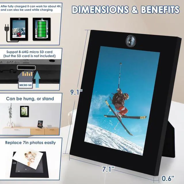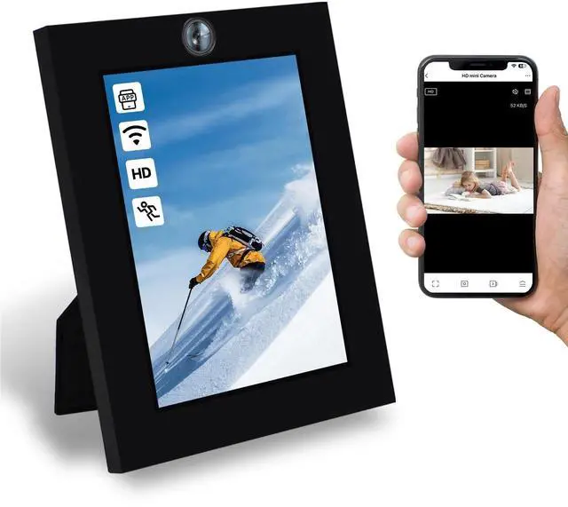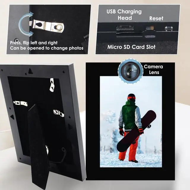 After turning on loop recording, when the micro SD card is full, the latest file will overwrite the oldest file ^^ The indoor camera has a built-in rechargeable large-capacity battery, which can work for about 4 hours after being fully charged; the nannycam can also be connected to the power supply for 24 hours to support recording while charging ^^ The stylish and simple all-match black photo frame can hold 7in photos. Replace your favorite photos and it will be one of the fashionable combinations in the living room/bedroom ^^ It can be an ordinary and fashionable photo frame, or a security camera to protect the privacy and security of the home/office, and it can also record the growth of children and pets