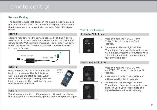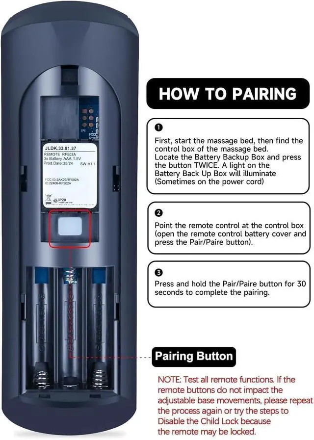 Please pair before use: Step1) Locate the Battery Backup Box and press the button TWICE. A light on the Battery Back Up Box will illuminate. Step2) On the back of the remote under the battery cover, press and hold down the PAIR button. The PAIR button will illuminate blue and start flashing. When the PAIR button stops flashing, the illuminated light on the Battery Backup Box will go out. Release the PAIR button. The remote is now paired to the adjustable base. Step3)Test all remote functions. If the remote buttons do not impact the adjustable base movements, please repeat the process again or try the steps to Disable the Child Lock bec
