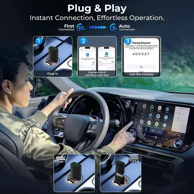 Please Note: This CarPlay Dongle converts only existing wired CarPlay/Android Auto; it cannot add functionality to unsupported vehicles. ^^ Plug & Play with Instant Auto-ConnectEnjoy true plug-and-play convenience. Powered by dual-band Wi-Fi and Bluetooth 5.0, this Wireless CarPlay & Android Auto Adapter connects in about 10 seconds for the first time. Thereafter, the CarPlay Dongle converts your startup into a seamless experience, reconnecting automatically in under 5 seconds with near-zero latency. ^^ Stable PerformanceEngineered for reliability, this Wireless CarPlay & Android Auto Adapter features an innovative cooling system to prevent overheating and drops. This CarPlay Dongle converts your connection into a consistently stable link, ensuring smooth, uninterrupted navigation, music, and calls on every drive. ^^ Compact & Discreet DesignDesigned to be unseen. This compact Wireless CarPlay & Android Auto Adapter features a low-profile, minimalist build that fits discreetly into your cars interior. The CarPlay Dongle converts your setup without adding clutter, maintaining a clean and professional look. ^^ Worry-Free Technical SupportWe offer dedicated support for this Wireless CarPlay & Android Auto Adapter to ensure a smooth setup and experience. Please confirm your vehicle has a factory wired CarPlay/Android Auto systemthis CarPlay Dongle converts only such systems and requires a touchscreen to operate.