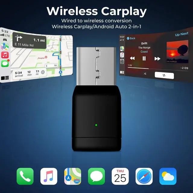 Universal 2-in-1 Wireless Adapter for 98% of VehiclesThis Wireless CarPlay & Android Auto Adapter seamlessly converts wired systems in 98% of compatible vehicles. It works with iPhones (iOS 10+) and Android phones (Android 11+), and includes a USB-C adapter for both standard USB and modern USB-C ports.