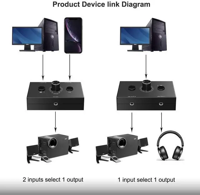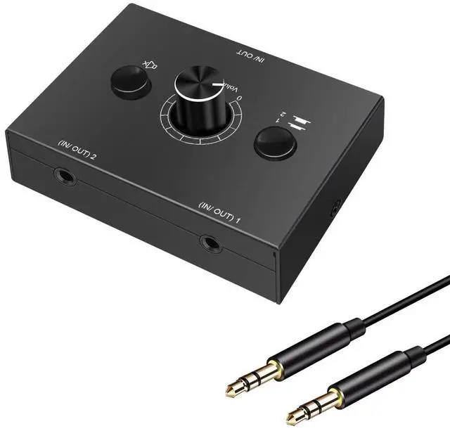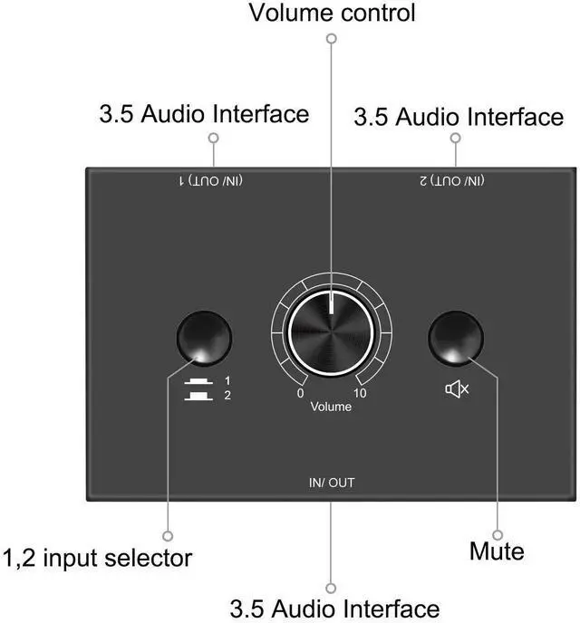 2-IN-1-OUT/1-IN-2-OUT 3.5 mm Audio selector designed for customers having several audio sources and outputs ^^ Select audio input between 1 and 2 with 1/2 switcher and get one output; ^^ Select audio output between 1 and 2 to receive one input ^^ One key to mute very useful under special conditions ^^ Plug and play, No power needed Won't affect sound quality