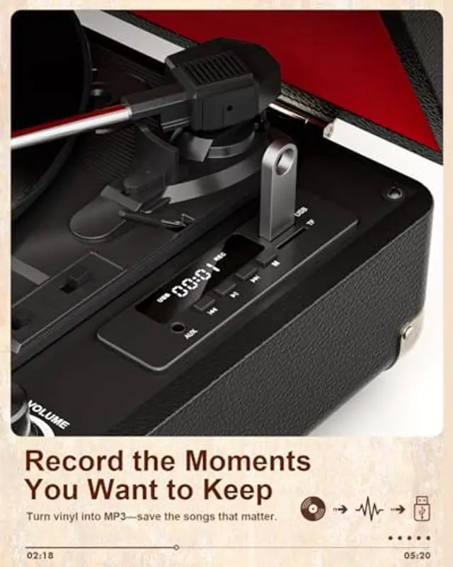 Controls: Belt-drive turntable with spring suspension reduces vibration for stable playback and protects your records. Supports 3 speeds (33 / 45 / 78 RPM) with auto stop for worry-free listening, making it ideal for beginners, casual listeners, and anyone new to vinyl record players. ^^ A Fun Gift & Stylish Decor: More than a record player its a stylish home decor piece and a thoughtful gift in one. A great gift for music lovers, parents, friends, or couples, perfect for birthdays, holidays, housewarmings, anniversaries, and special moments that deserve something meaningful.