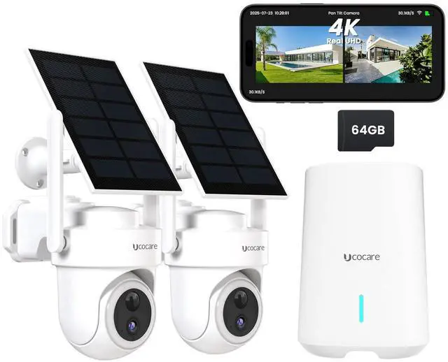 UCOCARE Solar Security Camera System, Stable 300m WiFi Coverage, 4K Solar Cameras for Home Security with Base Station, 64GB TF Card, No Subscription, 360 AutoTracking, 5G & 2.4G WiFi, 2 Cam-Kit