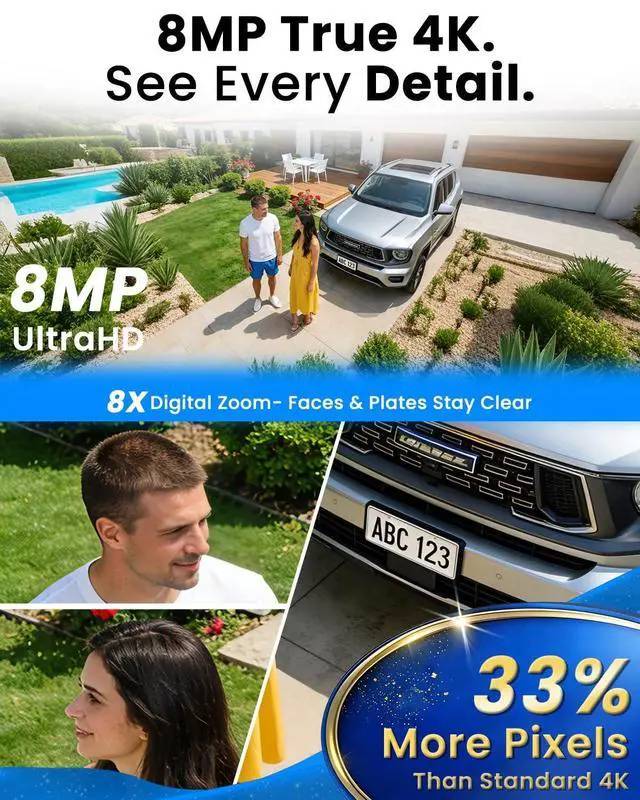 True 4K Ultra HD Resolution See Everything in 4K, Day & Night. This outdoor security camera delivers crisp 3840 x 2160 resolution with 8X digital zoom, capturing faces and license plates with ease.