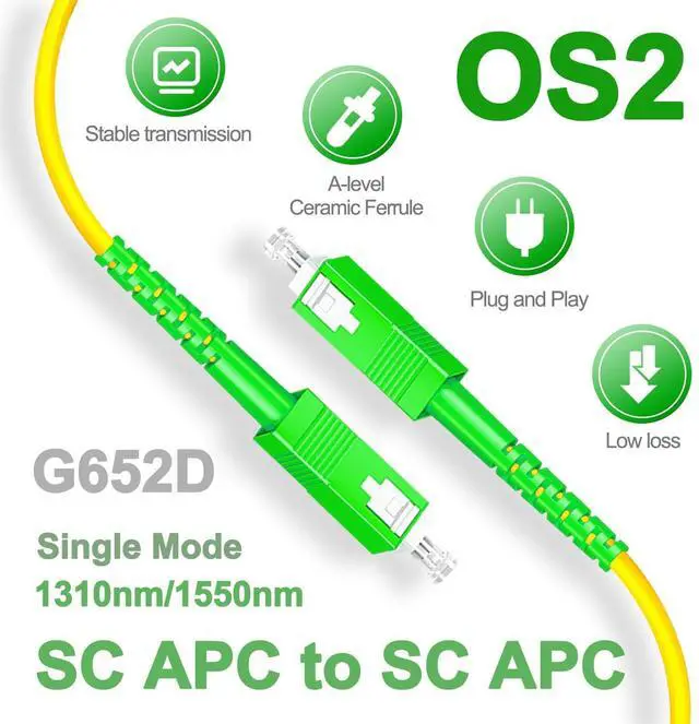 Main Parameters5Pcs 5 Meter ( 16.4 ft) SC APC to SC APC Single Mode Simplex OS2 Fiber Optic Patch Cord9/125 m G652D fiber core, which supports 1310nm/1550nm wavelength ^^ High PerformanceThe fiber patch cord 0.2 dB repeatability and interchangeability, 0.3 dB insertion loss, and 60dB return loss. The low insertion loss and high return loss ensure stable transmission. which can operates reliably in a temperature range of -20~70C. ^^ 3.0 mm&LSZH Fiber Jacket The Fiber Optic Patch Cord is buffered to the specified size of 0.9 mm with LSZH material, and a Reinforced yarn is used as a strength member to wrap the 0.9 mm buffer layer.