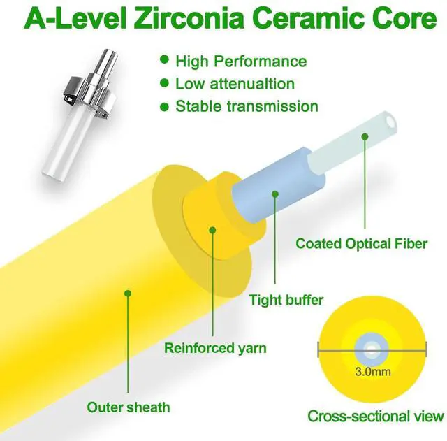 The 3.0 mm external LSZH jacket is used to protect the internal structure. It is equipped with an A-level zirconia ceramic core, ensuring data transmission quality and providing good tensile performance and flame retardancy for the cable. ^^ OS2 9/125m FiberCompared to traditional Fiber Optic Patch Cords, the 9/125m OS2 bend-insensitive single-mode fiber optic patch cord has lower attenuation when bent or twisted, making installation and maintenance more efficient. ^^ Wide ApplicationOS2 fiber optic patch cords are suitable for various network connections, including SFP optical modules, and are widely used in data centers, enterprise networks, telecommunications rooms, servers, cloud storage networks, and other scenarios.