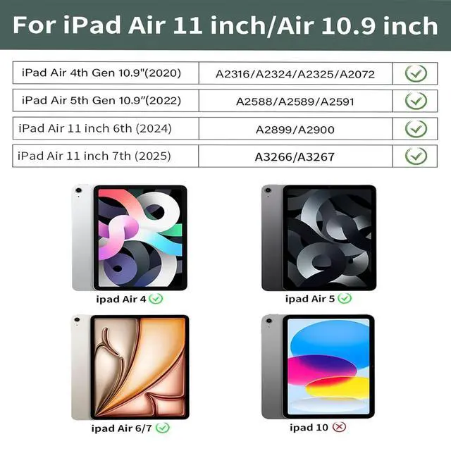 Compatibility]: The keyboard case is compatible with iPad Air 11-inch (M4/M3/M2) 2026/2025/2024 (A3459/ A3460/ A3463/ A3266 / A3267/ A3270/ A2902 / A2903/ A2904), for iPad Air 5th/4th Generation 2022/2020 10.9 inch (A2589/ A2591/ A2588/ A2072/ A2316 / A2324 / A2325). It is not compatible with any other models. Please check the model number starting with "A" on the back of your iPad before purchasing. ^^ [Slim