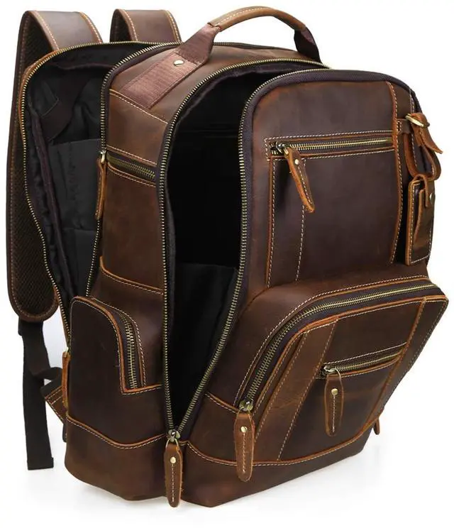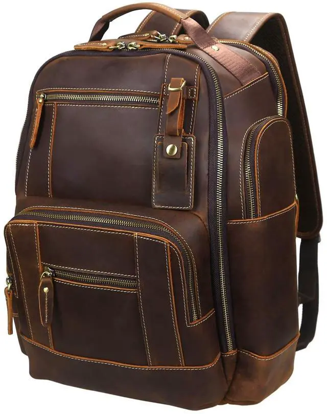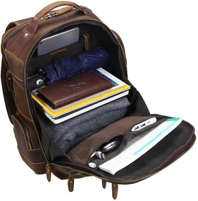 Dimensions: 17" (H) x 7.8" (W) x 13.7" (L), weight: 3.9 lb, 24L. ^^ Innovative mesh back panels and adjustable straps for comfortable wearing, it won't stain your clothes. 2 main compartments. Front main compartment has multifunction pockets to keep everything neat and organized. Back main compartment designed with 1x sleeve for a 15.6" laptop and 1x sleeve for a 12.5" iPad Pro. ^^ Zip side pocket at both sides for water bottle or umbrella. Features a back belt that slips over luggage handles. Stack this large capacity backpack on your wheeled luggage to free your shoulder or hands while carrying heavier stuff. ^^ Better with Age design. The leather has been treated to look and feel aged while retaining its toughness. The more you use it, the better it looks.