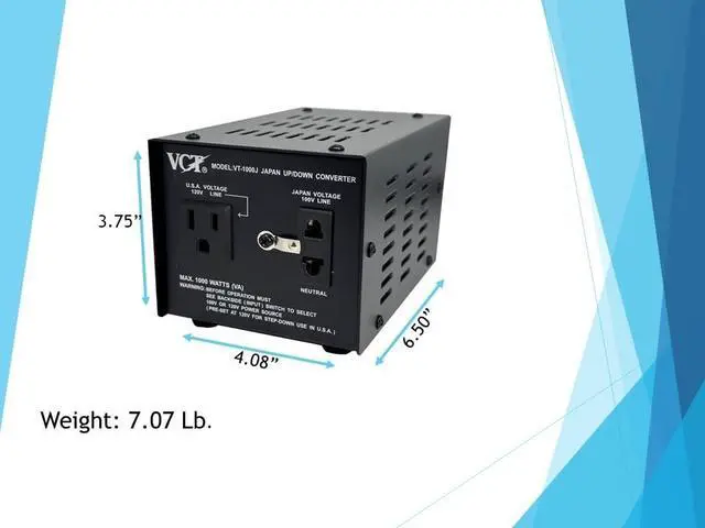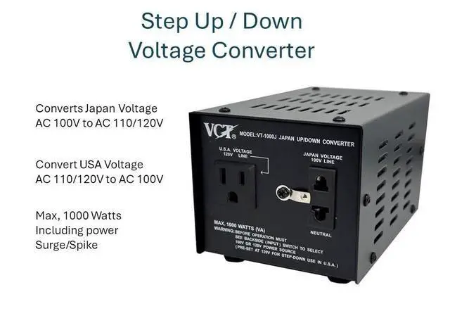 Product DescriptionVCT VT-1000J - Japanese Step Up/Down Voltage Transformer Converts Japan 100 Volts To 120Volts OR Vice Versa -1000 WattFrom the ManufacturerThis voltage transformer enables the use of Japanese products in USA or the use of american products in Japan. This transformer is capable of both up/down voltage conversions for Japan/USA. It Can be used in both 100 and 120 volt countries. This transformer will convert from 120 volt to 100 volt AND from 100 volt to 120 volts -