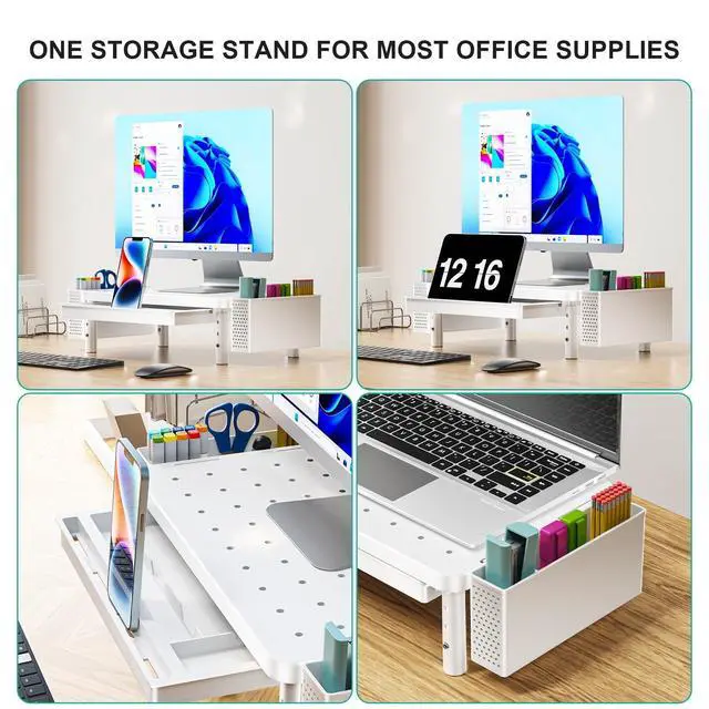 Save Space: This monitor stand includes a built-in drawer and two hanging pen holders, offering ample storage space for office supplies and accessories, helping to keep your workspace tidy and productive ^^