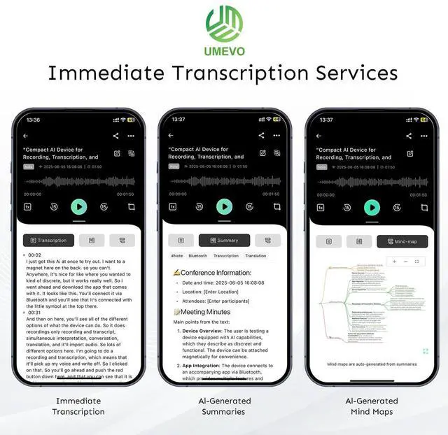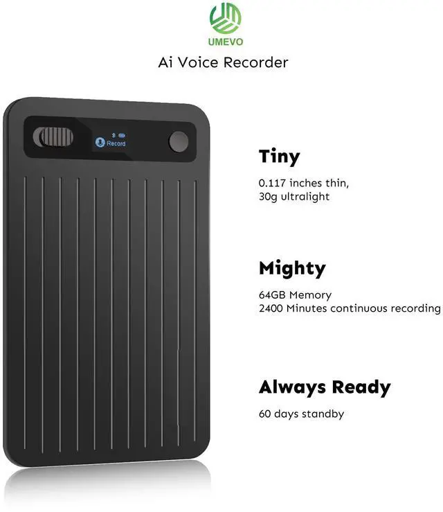 Unlimited AI Transcribe Note Voice Recorder: Powered by the latest GPT-5 model, the UMEVO voice recorder integrates recording, AI transcription, summarization, mind mapping, and translation across 140 languages. It supports up to 30 hours of recording and 64GB of storage. UME UMEVO is your ultimate AI personal assistant for meetings, interviews, and calls. Free unlimited transcription for the first year ^^ Data Privacy and