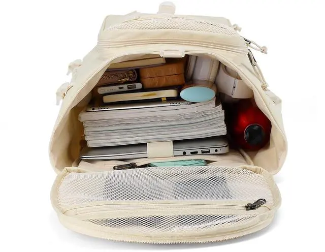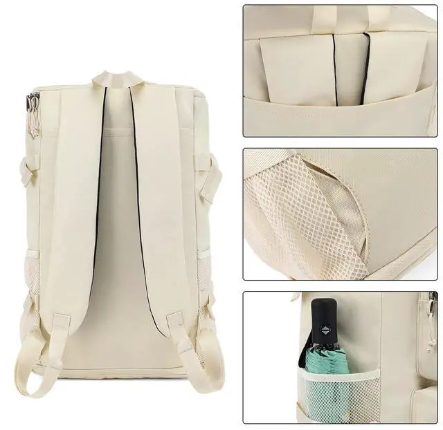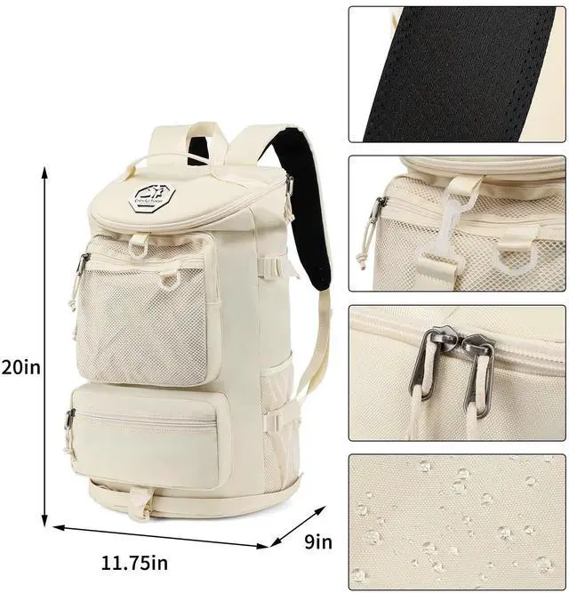Dimensions 11.75 x 9 x 20 inches (L x W x H). Lightweight, only 1.98LB. ^^ Large Capacity Roomy Space with practical pockets provides you enough items storage and helps you organize them easily, including 1 front pocket/1 main large compartment/2 side pockets (for bottle and umbrella) /1 shoe compartment. The main compartment contains 1 upper mesh zip pocket, 1 notebook compartment, 2 zip pockets, and 2 slots, can hold your iPhone, iPad, pen, keys, wallet, magazine, clothes, and also be placed in cameras, power bank, etc.