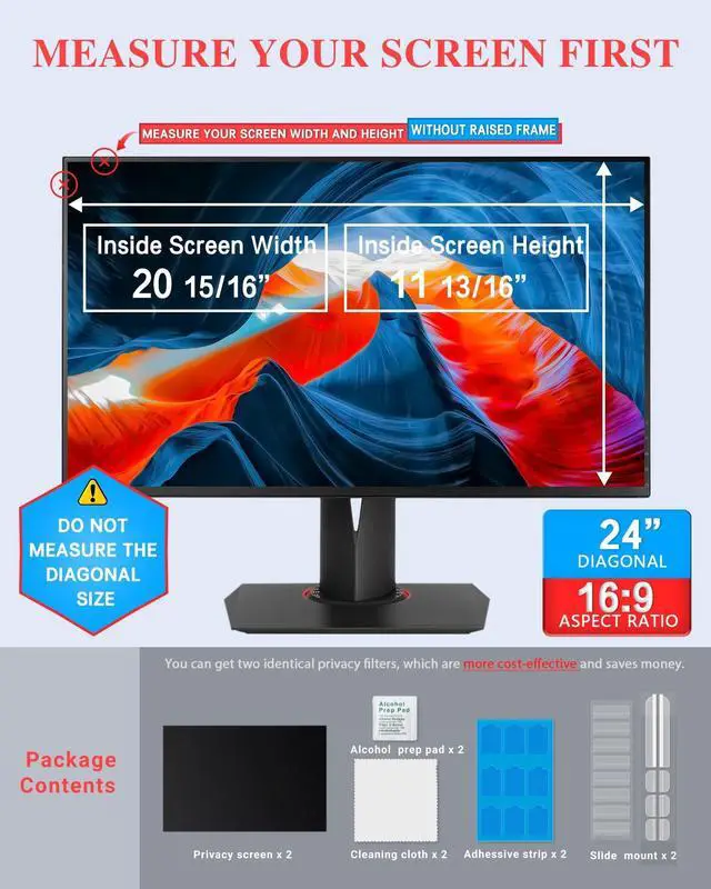 Includes: 2x Privacy Filter (24" 16:9 ), Microfiber Cloth, Quick-Start Guide