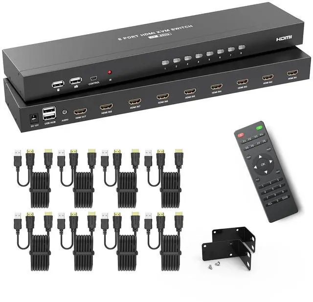 ^^ Package Includes: 1* 8 port KVM Switch HDMI, 1* IR Remote Control, 8*HDMI Cables, 8*USB Cables, 1* user manual, 1* set rackmount ears & screw, 1* 12V DC Power Adapter