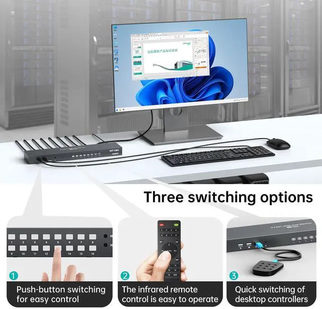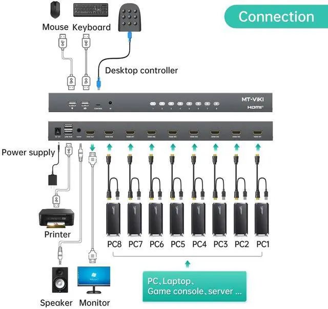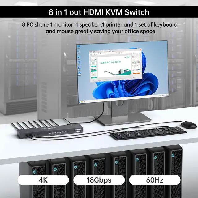 MT-VIKI KH8S, this 8 port kvm switch hdmi allows you to manage up to 8 computers by 1 monitor, keyboard and mouse at 4k 60hz HD quality; Come with 4 USB 2.0 hub. Perfect for 19-inch rack cabinet ^^ HDMI KVM Switch Support Resolution up to 4K@60Hz, and backward compatible 4K@30Hz, 1080P. Support HDMI 2.0, HDCP 2.2, 18Gbps. ^^ USB HDMI switch with 4 USB 2.0 ports for sharing keybaord, mouse, printer, U disk and more other USB devices. Support wireless keyboard and mouse. ^^ KVM Switch 4K@60Hz with Audio Output Support 2 Ways for