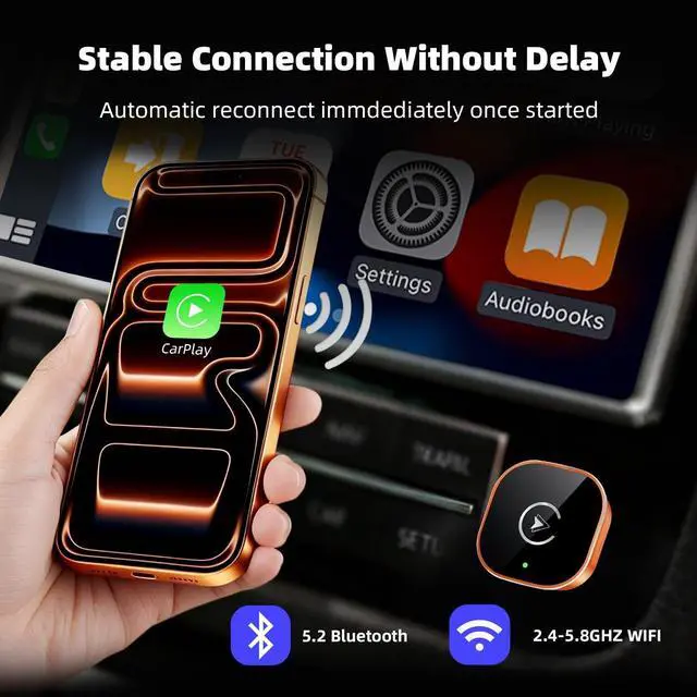 ^^ Fast Connectivity: Our wireless carplay adapter equipped with latest 5.8 GHz WiFi, Bluetooth 5.2, and a next-gen chip, new generation chip for 300% faster transmission speeds, stable and uninterrupted connectivity on bumpy roads. Experience transmission speeds 3 times faster than other adapters.