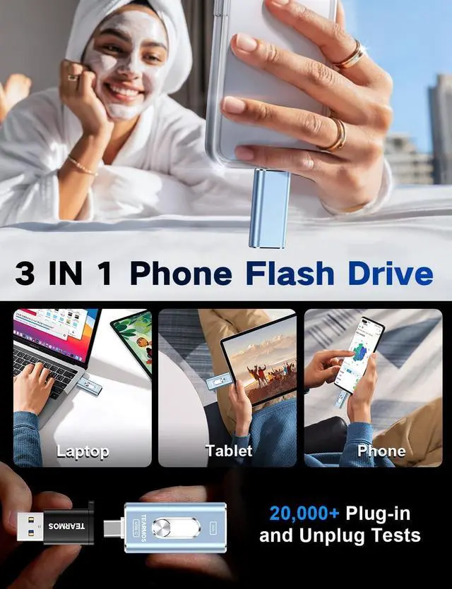 (Note: Requires iOS 13 or higher for iPhone; Android devices must support OTG) ^^ Blazing Fast Transfer SpeedsTransfer photos, videos, and files in a flash! With read speeds up to 30 MB/s and write speeds up to 15 MB/s, our USB stick outperforms standard drives. Edit on the go without buffering or lag, and enjoy a smoother workflow. Lets you effortlessly backup and organize photos, and videos from your phone straight to the phone storage photo stick, freeing up valuable device space.