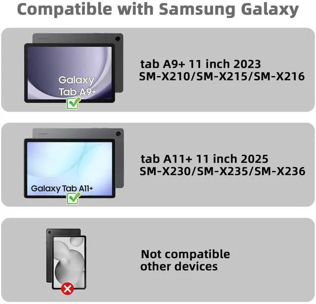 Attention CompatibilityThis bluetooth tablet keyboard case is Only compatible for Samsung Galaxy Tab 11+ 11" 2025 (SM-X230/SM-X235/SM-X236), Tab A9+ 11" 2023 (SM-X210/SM-X215/SM-X216). It will NOT work for any other model device, please you carefully check before buying it. ^^ Magnetic Removable KeyboardThis Samsung Tab A9+ case and keyboard are magnetically attached so the keyboard can be removed at any time and the case can be used on its own. Ideal for business trips, traveling and studying on the go. ^^ All-Day ProtectionDurable PU leather cover and anti-slip rubber-lined interior provide full protection for your tablet, greatly reduces the damage to your tablet caused by collisions.
