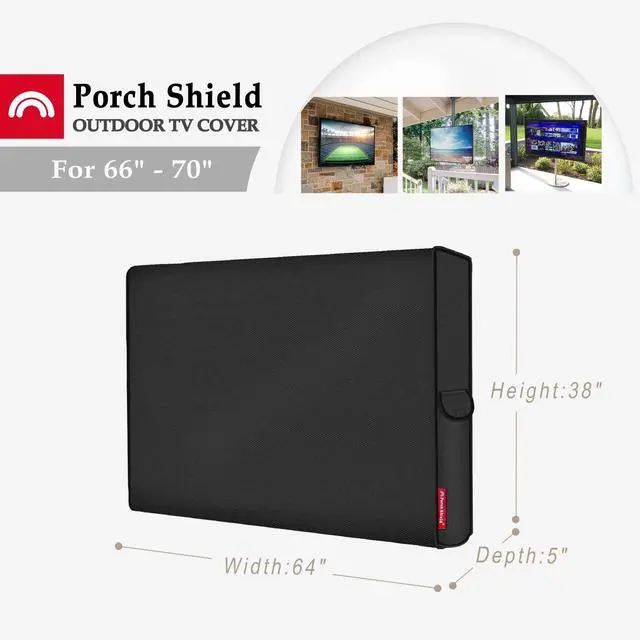 Dimension - 64W x 38H x 5D inch. Suitable for 66-70 inches LCD, LED and Plasma Flat TV Screen with cables. ^^ Material - Made of 600D oxford with waterproof coating and seam sealing taped. Heavy duty fabric make outside TV cover good performance of dustproof, waterproof and weatherproof to against severe weather and soft inside fabric can't scratch your TV. ^^ Mount Compatibility - Back Velcro strip instead of back zipper. Compatilbe better with sorts of wall/ceiling mounts and stands. Back space enough also makes it easier for you to hide TV cables, wire etc.