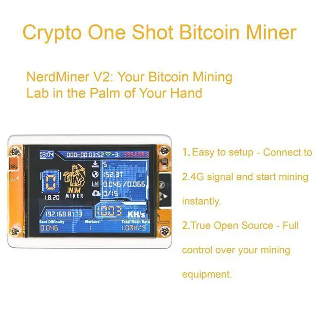 Smart Display: Monitor mining in real time with a bright, clear screen. Instantly view key stats like hashrate (~1010 KH/s), blocks found, temperature, and Bitcoin address statusall in an easy-to-read layout.
