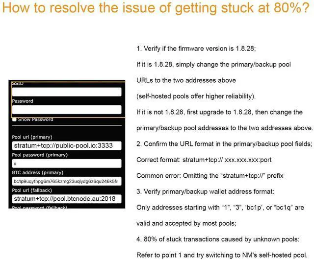 Verify primary/backup wallet address format: Only addresses starting with 1, 3, bc1p, or bc1q are valid and accepted by most pools; 4. 80% of stuck transactions caused by unknown pools: Refer to point 1 and try switching to NM's self-hosted pool.