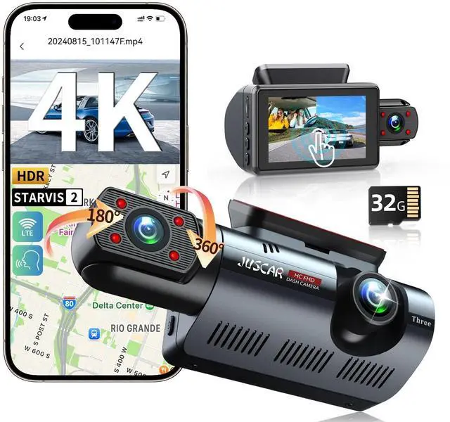 ^^ Superior Night Vision with Infrared LEDsCapture clear footage in low light with a 6-glass lens, F 1.4 aperture, and HDR technology. The dash cam auto-adjusts settings for optimal clarity. The inside cameras hidden infrared LEDs ensure flawless recording, even in total darknessperfect for rideshare drivers like Lyft, and Taxi, ensuring safety and clarity during nighttime rides. ^^ 24H Parking Mode & 32GB Memory Card IncludedThe Juscar dashcam offers 24-hour Parking Mode, automatically recording when a collision is detected, keeping your vehicle monitored at all times. The package includes a 32GB memory card for immediate setup.