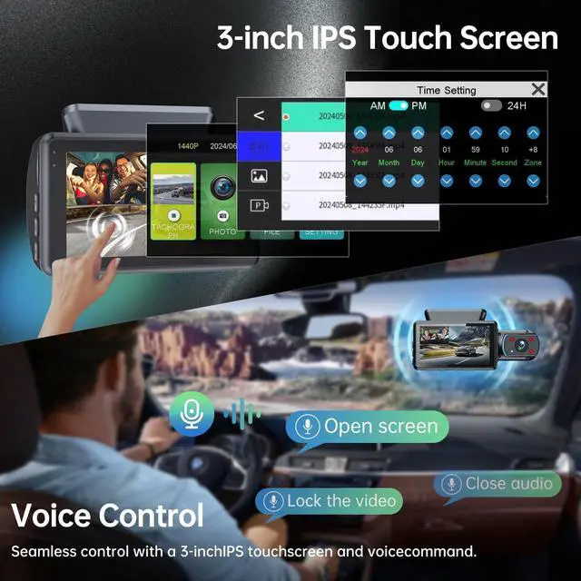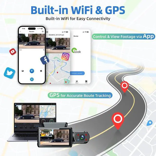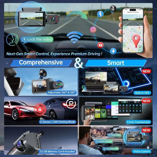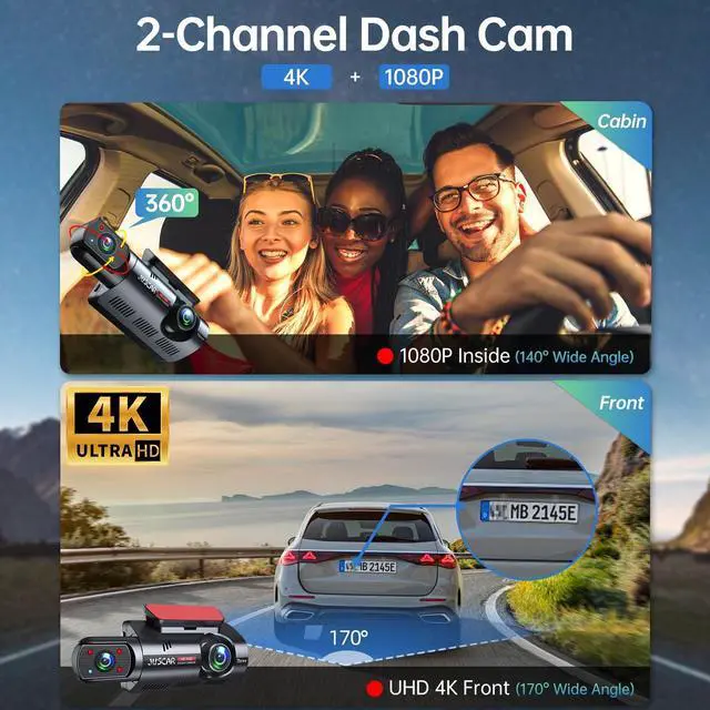 Ultra HD 4K & 1080P Front and Inside Dual Dash CamCapture every detail with the Ultra HD 4K front camera and 1080P inside camera. The 170 Ultra-Wide Angle front lens and 140 wide-angle inside lens minimize blind spots, ensuring you capture crucial details like road signs and license plates. This Dual dash cam is perfect for gathering valuable evidence in accidents or disputes, offering comprehensive coverage and peace of mind. ^^ WiFi, GPS & 3 IPS Touchscreen Dash CameraEasily connect via built-in WiFi to view, download, and share footage instantly. GPS tracking logs your route and speed with precision.