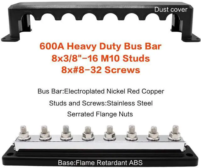 Terminals: AMOMD rated current 600A busbar with M10 (3/8 inch) terminal studs (also applicable to M8) and 8 #8-32 screws ideal for multiple batteries wiring configurations, stainless steel material can enhance their corrosion resistance and rust resistance ^^