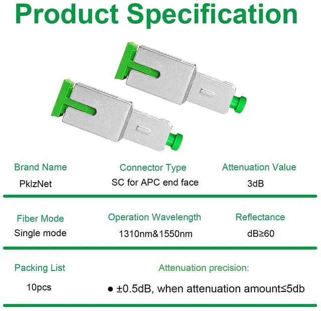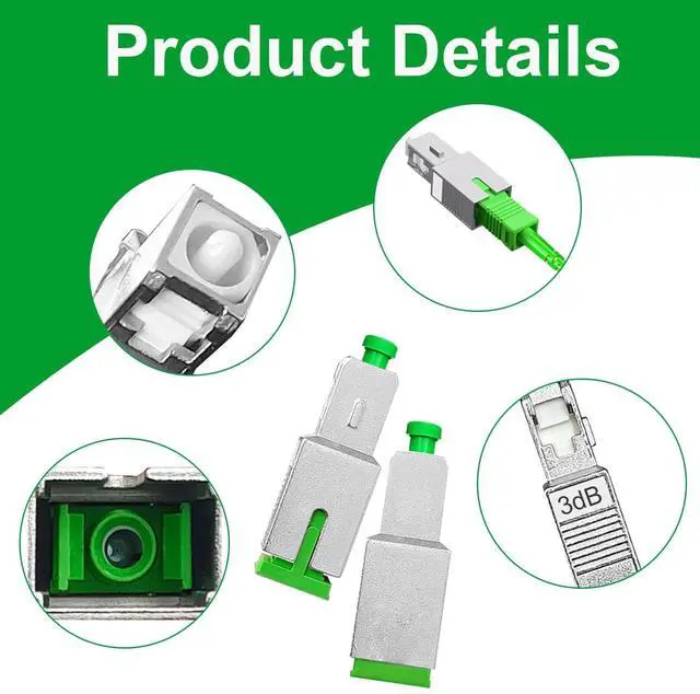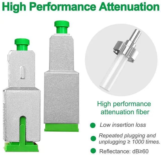 Good PerformanceSC Fiber Optic Attenuator: With high-precision attenuation of 0.5 % dB, polarization related loss 0.2 dB, and return loss 60dB, it maximizes signal integrity and transmission stability. ^^ Plug and PlayThe fiber optic attenuator is easy to install, and its component structure is simple, facilitating easy assembly and safe storage, and the flexible and convenient plug and play enables you to complete the task more efficiently. ^^ Product ApplicationWidely used in fiber optic communication, fiber optic testing equipment, fiber optic cable television, etc. Usually used for debugging fiber optic instruments, attenuation of fiber optic signals, etc.