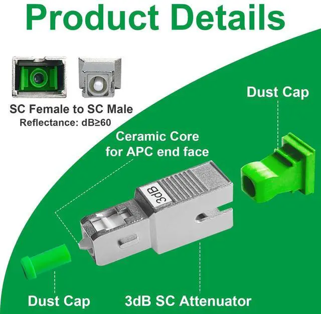 Connector TypeWith 3dB attenuation amount, SC female to SC male attenuator for APC end face, made of high-performance attenuated fiber. ^^ Product FeaturesThe feature of the product is that the optical attenuator is widely applied in fiber optic communication system, having characteristics like high precision, strong impact resistance and stable and reliable performance. ^^