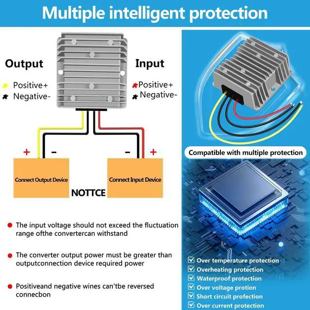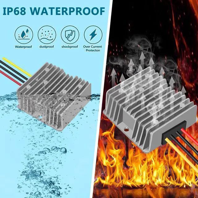 Output voltage: 24V ^^ DC 12V to DC 24V Step Down ConverterMaximum load current 15A 360W ^^ Widely used converter, ideal choice for low-power testing systems such as vehicles, safety systems, hospital equipment, telecommunications, LED products, LED strips, etc ^^ IP67 waterproof, short circuit protection, overvoltage, overload, overheating, easy to install Aluminum shell and silicone sealing design: waterproof, shockproof, moisture-proof, dustproof, more durable, better heat dissipation, high conversion efficiency, and good stability.