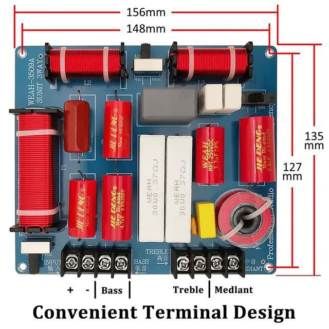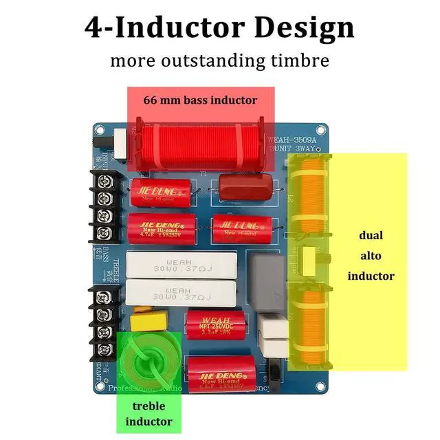 • Excellent Components66mm bass inductor, dual alto inductor, treble inductor, CBB capacitor, dual non-inductive capacitor, ceramic resistor, dual mediant adjustable switch, tweeter adjustable switch, professional audio capacitor, tweeter protector, high power resistor, HiFi capacitor