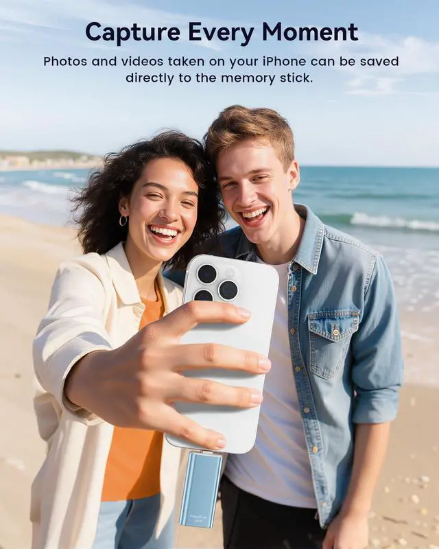 Anywhere: Easy to use, plug and play. With just one click, you can quickly back up videos, photos, contacts, and documents, eliminating tedious copying and pasting. Simply plug in your iPhone, iPad, or Android phone. Files are saved directly to the iPhone storage, freeing up valuable space. You can also share files directly from the photo stick for iphone to social media with one click, instantly sharing moments with friends and family.