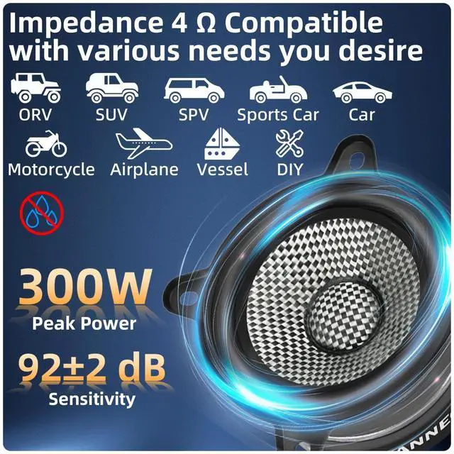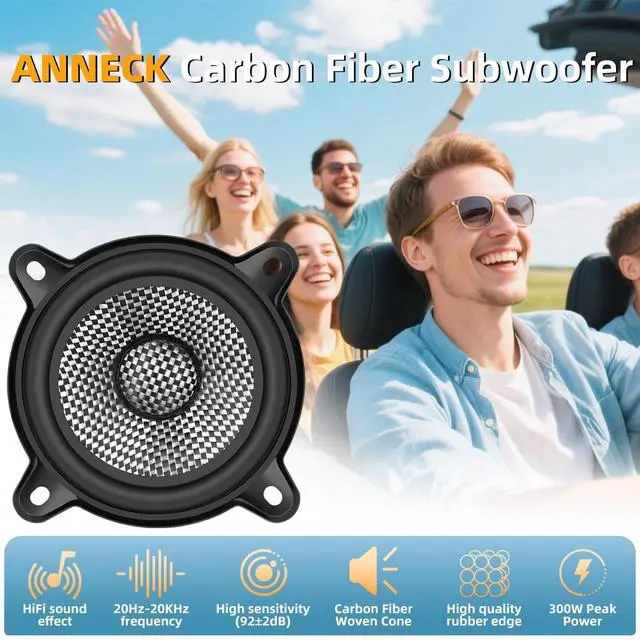 Ultra-High Performance Sound Experience concert-like audio clarity with our advanced 3.5" car speakers! Featuring an innovative precision-engineered carbon fiber cones, these speakers deliver powerful 300W peak power for punchy bass, detailed mids, and crisp highs. Perfect for music lovers who demand studio-quality sound on the go. ^^ Premium Durability for Any Environment Built to last, our speakers boast rugged aluminum alloy baskets, heat-resistant voice coils, and weather-resistant carbon fiber cones. Whether youre driving in extreme heat or cruising through rain, these speakers maintain flawless performanceseason after season. ^^ Perfect Fit & Effortless Installation Designed as direct replacements for most factory 3.5" speakers, these woofers come with all necessary mounting hardware.